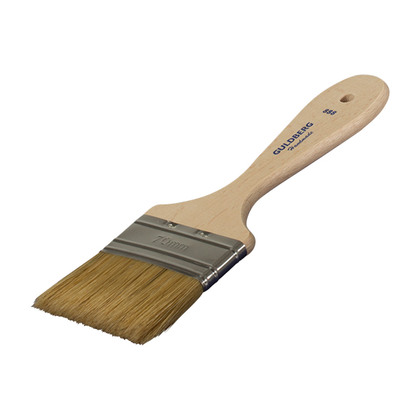 Guldberg Fernispensel 888 Syntetisk, er en håndlavet pensel og et af det bedste pensler der findes her hjemme. Kendetegnene ved en Guldberg pensel er, at den er håndlavet, hvilket er med at gøre den holder længere. Den er ergonomisk produceret, hvilket gøre den nem at arbejde med samt giver en flot og perfekt slutresultat. Guldberg er desuden FSC-mærket, på den måde er du som forbruger med til at sikre de sociale forhold og naturen der træet kommer fra. Det vil sige en bæredygtigt skovdrift, hvor træer fældes og hvor man samtidig sikre sig at skoven kan følge med. Guldberg Fernispensel 888, har en kort skafte, og derfor vil man have et godt greb i penslen. Guldberg Fernispensel 888 er med bløde hår og kort. Hårene er med til giver penslen en kraftig, samt en blød krop. Guldberg Fernispensel 888 er utrolig modstandsdygtig og en god spændstighed. Guldberg Fernispensel 888 er velegnet til letflydende maling så som akvarel og akryl og ikke mindst fernis. Guldberg Fernispensel 888 har en børstesammensætning der er med til at giver en særdeles flot finish. Guldberg pensler er kendt for at være en slidstærk pensel med god farvekapacitet og dækkeevne. Guldberg pensel er produceret i bøgetræsskaft der er ulakeret og findes i naturbørster eller syntetiske fibre. Til oliebaseret maling, så anbefales der naturbørster. Bemærk har den kun i størrelsen 100mm Se hele vores udvalg af pensler her