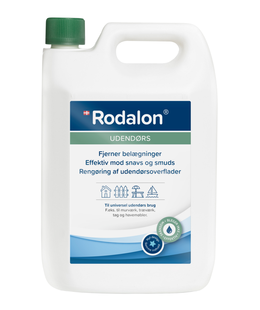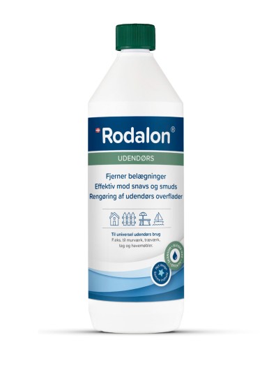 Rodalon Udendørs – Fjerner Belægninger er velegnet til rengøring af blandt andet tag, havemøbler, terrasse, murværk, trapper, fliser, båd, campingvogn, drivhus m.m. Produktet er et koncentreret middel, der skal fortyndes 1:10. Blandingen skal fordeles på overfladen og lade virke ca. 1 time. Herefter kan man med fordel bruge en svamp eller kost til at skrubbe. Malede og pudsede facader, murværk, træværk m.m. kan skylles af med vand, men som regel vil regnen skylle midlet af.